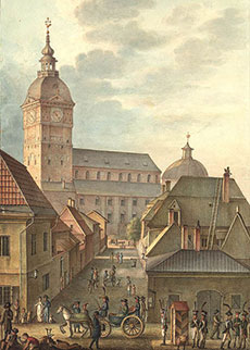 [ABOVE: Turku Cathedral, Finland, with its old tower before the great fire. 1814. Public domain, Wikimedia]