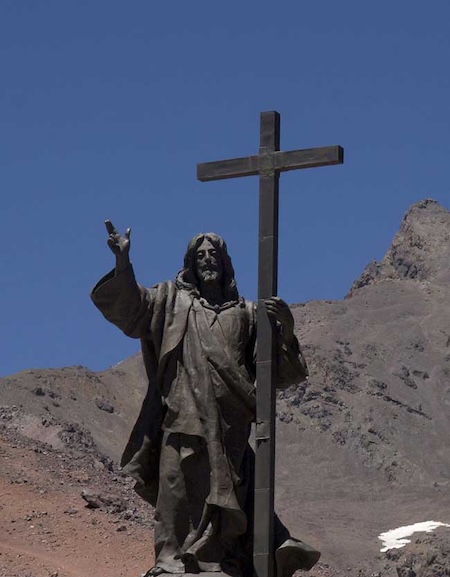Christ lifts his right hand in benediction, and his left hand holds a cross. One of the plaques at the base says, “He is our peace who hath made us one.” Another plaque, added in 1937, reads: “Sooner shall these mountains crumble into dust than Argentines and Chileans break the peace sworn at the feet of Christ the Redeemer.”