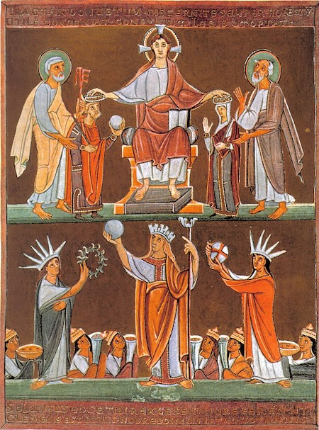 [Above: From the Pericope book of Henry II (in Bavarian State Library, CIm 4452, Fol. 2r); Top half, the small figures of Henry II and Cunegunde are crowned by Christ, behind them are Bamberg's patrons Peter and Paul (shown large as their importance merits). Bottom: people pay homage to personifications of the Roman, Gallic, and German Pericopes of Henry II / public domain from Middle Ages, Wikimedia]