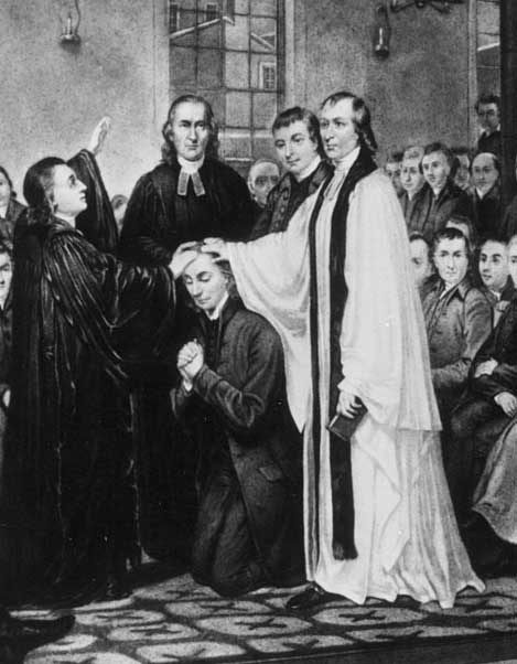 [Above: Thomas Coke Ruckle, painter; A. Gilchrist Campbell, engraver. Detail from the Ordination of Bishop Asbury, an engraving of an 1882 painting of the scene; - Drew University Methodist Collection (Madison, New Jersey) / public domain, Wikimedia]