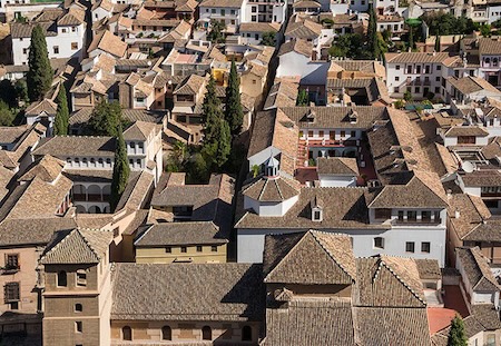 [ABOVE: Tiled roofs of patrician houses in the lower part of the Albayzin neighborhood, Granada, Spain. Jebulon / public domain, Wikimedia File:Roofs Albayzin Granada Spain.jpg I, the copyright holder of this work, hereby publish it under the following license: This file is made available under the Creative Commons CC0 1.0 Universal Public Domain Dedication]