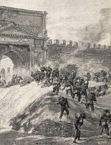 ["Capture of Rome" B. Console, La Breccia di Porta Pia. 1870. Fratelli Treves Editori–Milan, 1895—Public domain, Wikimedia]