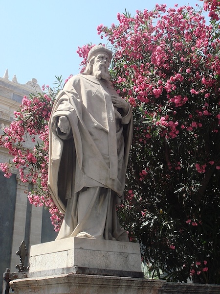 [ABOVE: Cathedral of Catania - 19th century statue of Saint Athanasius, signed by a G. Nicoli, in the "Floretta" (the nearby garden). Picture by Giovanni Dall'Orto, July 4 2008. Giovanni Dall'Orto, the copyright holder has released it for any use as long as he is attributed / Wikimedia]