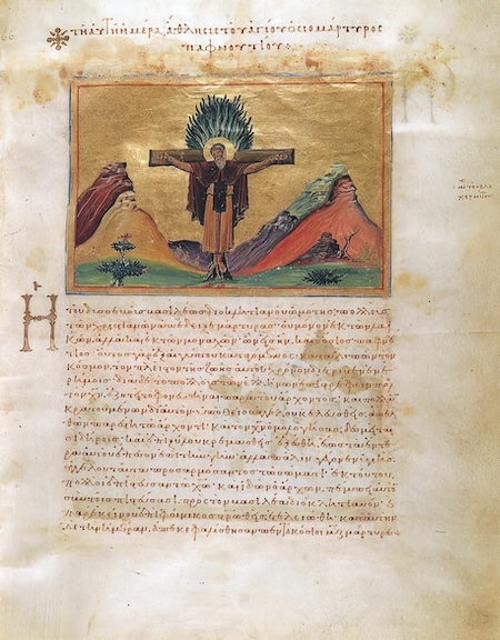 [ABOVE: Illumination of Paphnutius in Menologium of Basil II. Circa 976 to 1000. Vat.gr.1613, p. 66—Biblioteca Apostolica Vaticana / Public domain, Wikimedia]