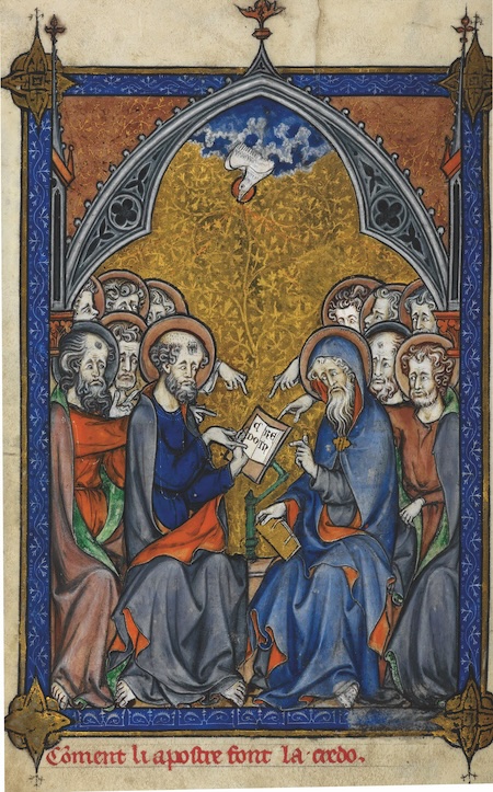 [ABOVE: A medieval manuscript imagines the Spirit-inspired apostles composing the Apostles’ Creed. Laurent d’Orléans, Illustration Comment li apostre font la credo in La Somme le Roi. 1279. MS 54180, f.10v—British Library / Public domain, Wikimedia]