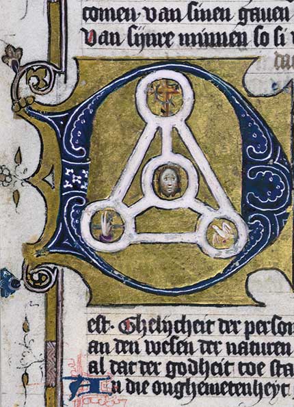 [ABOVE: Symbolic representation of the Trinity in Duke Albrecht’s Table of Christian faith (winter part), Walters Ms. W.171, f.2r. 1400 to 1404. Utrecht, Netherlands. Parchment—Public domain, The Walters Art Museum, Baltimore]